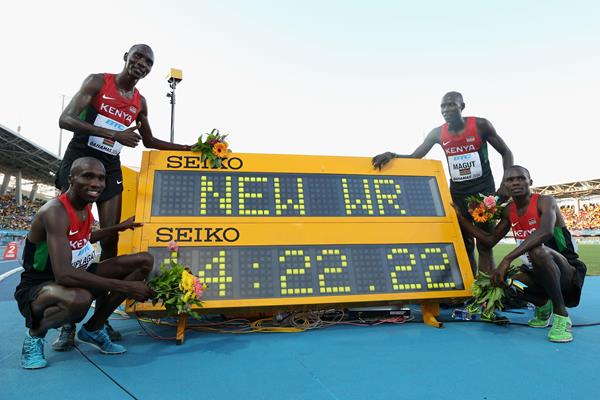 26 MAY 2014 (L-R) Silas Kiplagat, Asbel Kiprop, James Kiplagat Magut and Collins Cheboi of Kenya after setting a world record of 14:22.22 in the men's 4x1500m at the IAAF World Relays