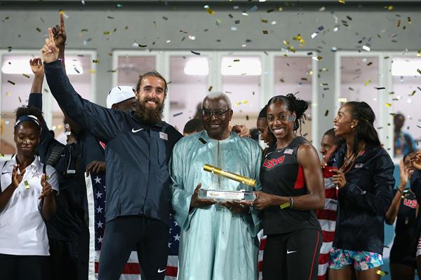 26 MAY 2014 IAAF President Lamine Diack awards the Golden Baton to the USA, the overall best team at the inaugural IAAF World Relays