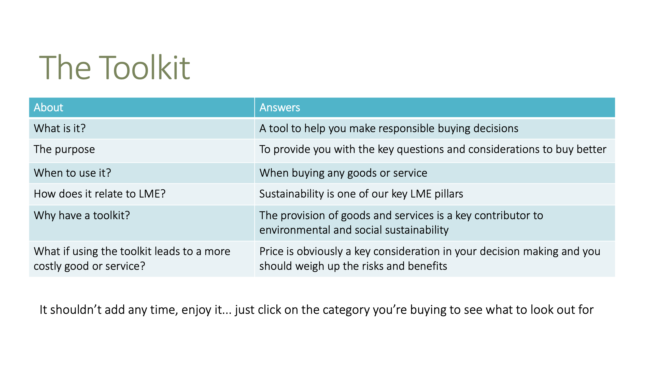 - Create a sustainable procurement matrix detailing service provision and associated sustainability impact and scale to prioritise the procurement process