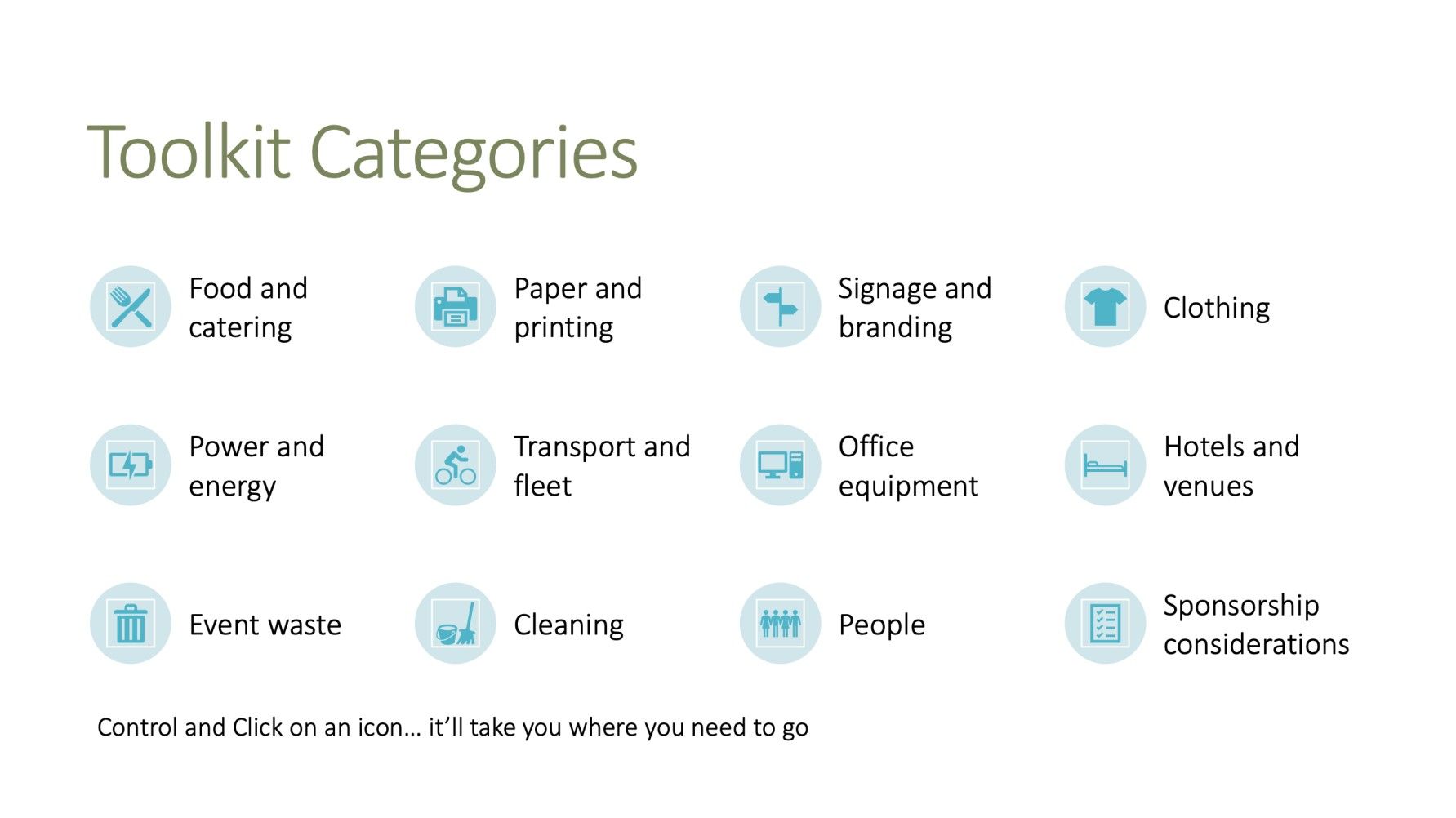 [Sustainability Leadership] [Developing Your Sustainability Plan] [Sustainable Procurement] [Waste Management] [Energy Management] [Food Management] [Water Management] [Travel Planning] [Accommodation] [Carbon Neutrality] [Air Quality] [Diversity, Accessibility and Inclusion] [Health Safety Wellbeing] [Monitoring and Reporting] [Communications]