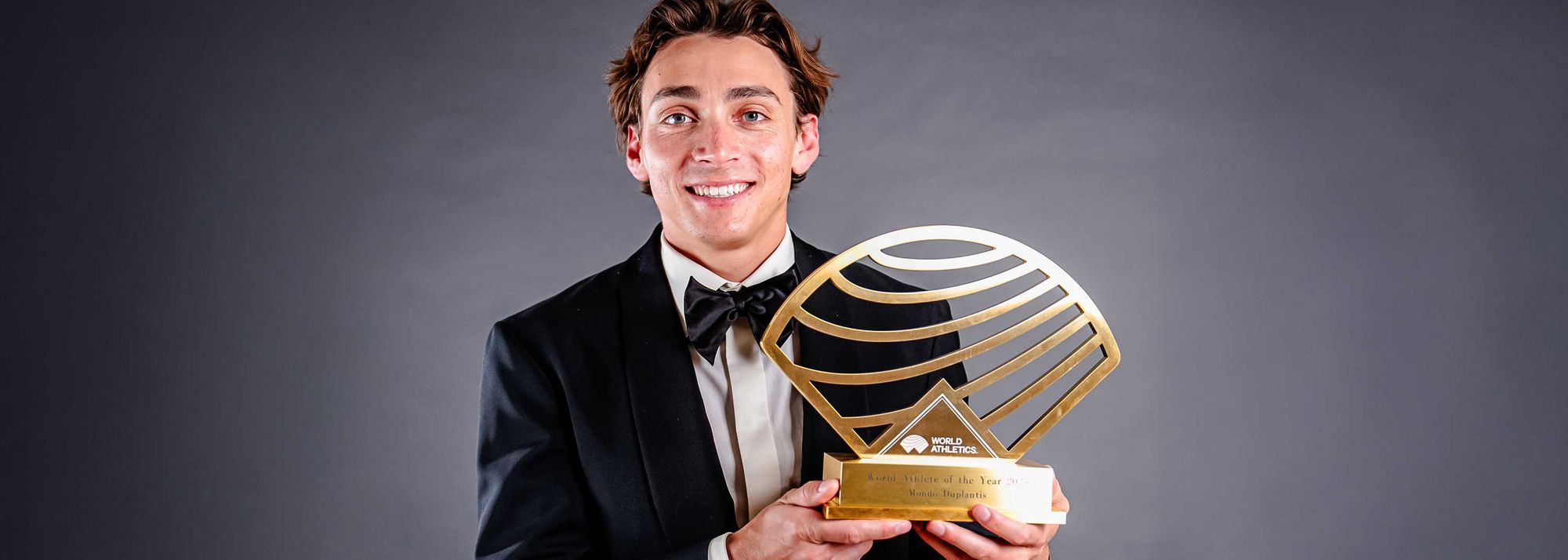 Mondo Duplantis receives his World Athlete of the Year award in Monaco (© World Athletics Christel Saneh)