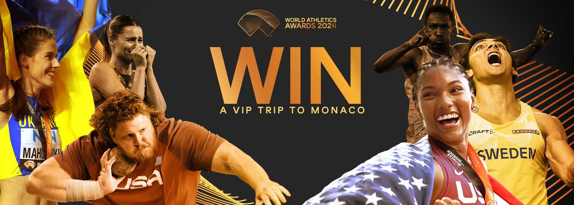 The World Athletics Awards will take place in Monaco on 1 December, honouring the best athletes of 2024, and we want you to be part of this extraordinary celebration. Enter below for a chance to win one of two incredible prizes: 1) a trip for two people to Monaco from 29 November to 2 December 2024 or 2) a digital meet and greet with one or more World Athletics finalists.