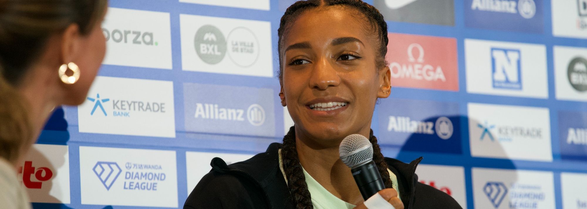 Nafi Thiam speaks at the press conference of the Wanda Diamond League meeting in Brussels (© Matthew Quine / Diamond League AG)
