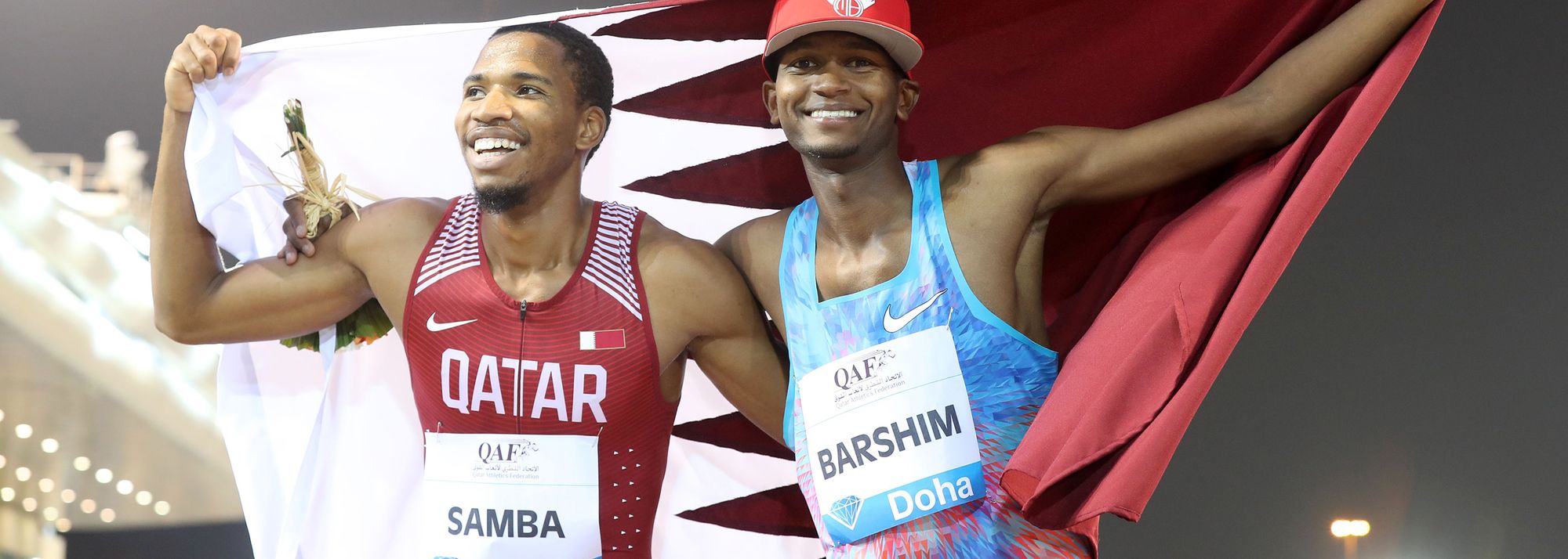 Qatar's Abderrahman Samba and Mutaz Barshim in Doha (© AFP / Getty Images)