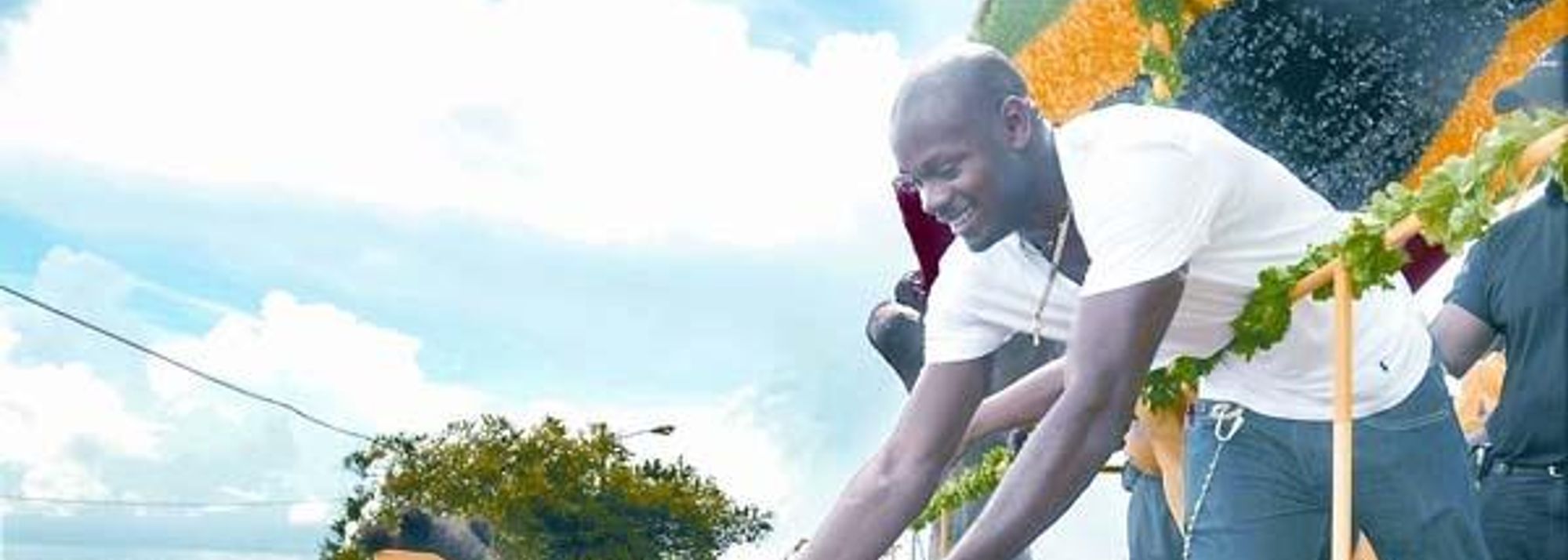 Beijing Olympic relay gold medal winner Asafa Powell is handed a baby by some one in the crowd during Friday’s national parade in Kingston (© Paul Reid)