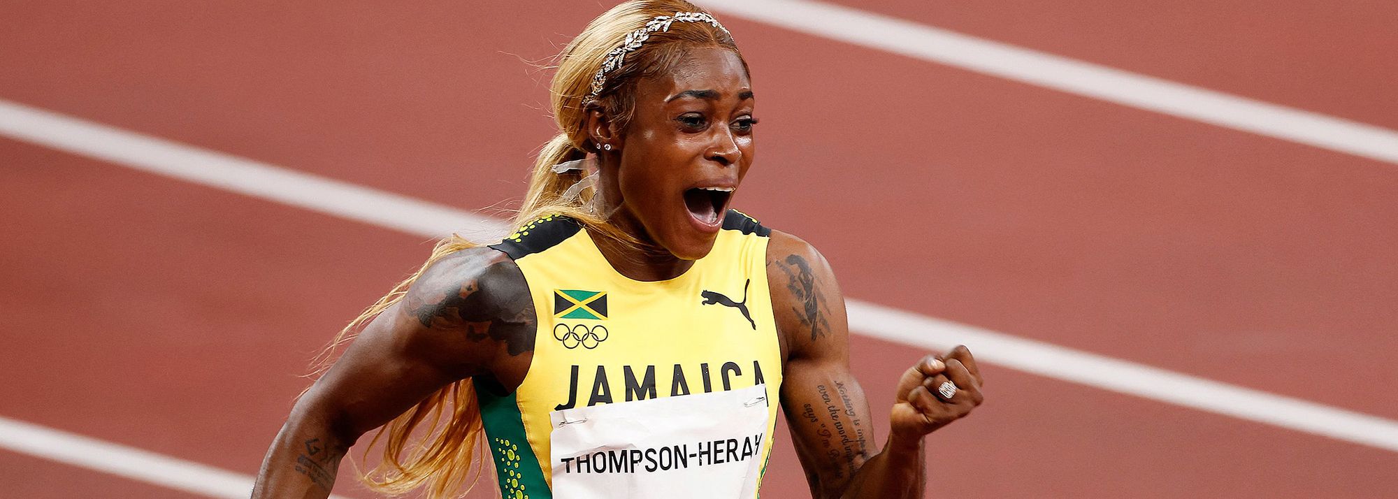 100m winner Elaine Thompson-Herah at the Tokyo Olympics (© AFP / Getty Images)