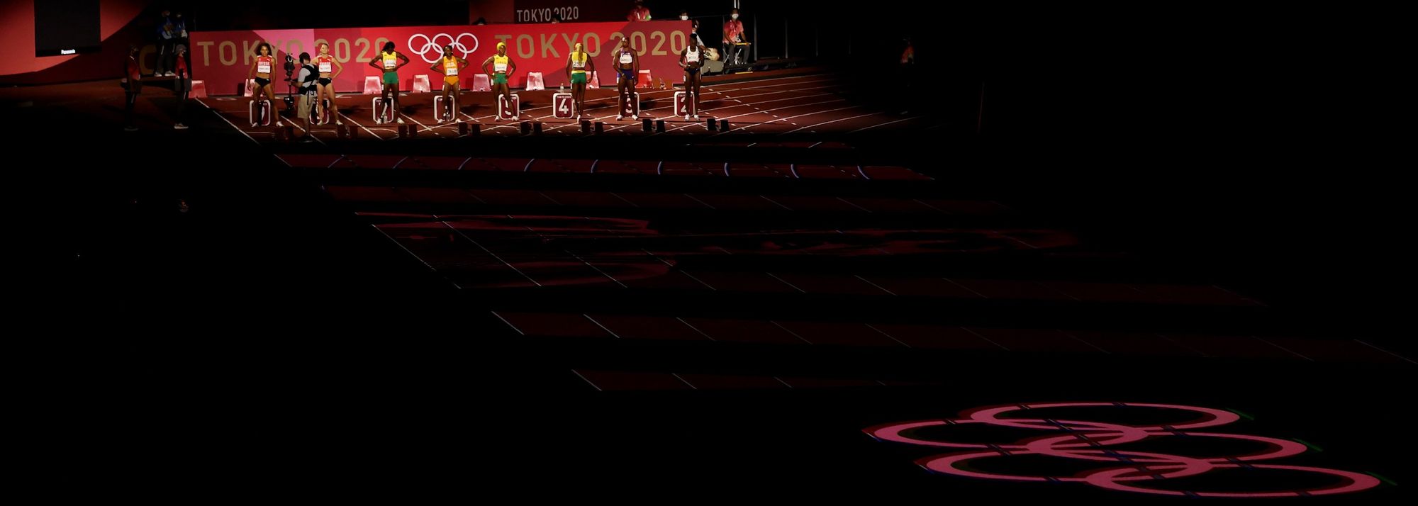 Projection mapping light show introduces the women's 100m final at the Tokyo 2020 Olympic Games (© Getty Images)