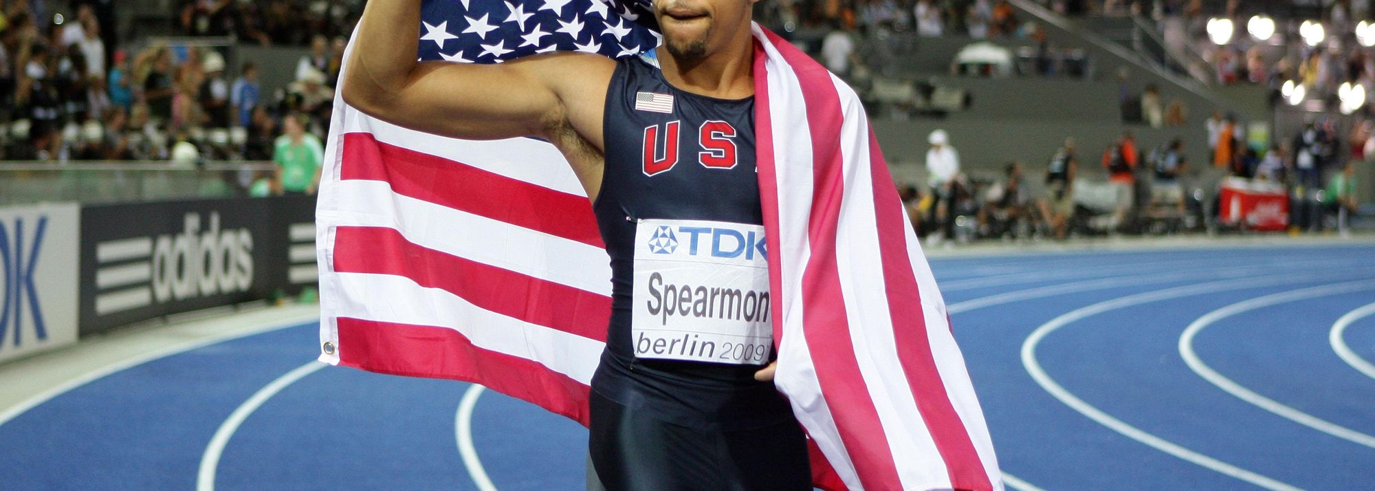 Wallace Spearmon of the United States banishes his Olympic demons and celebrates winning the bronze medal in the men's 200m at the 12th IAAF World Championships in Athletics in Berlin (© Getty Images)