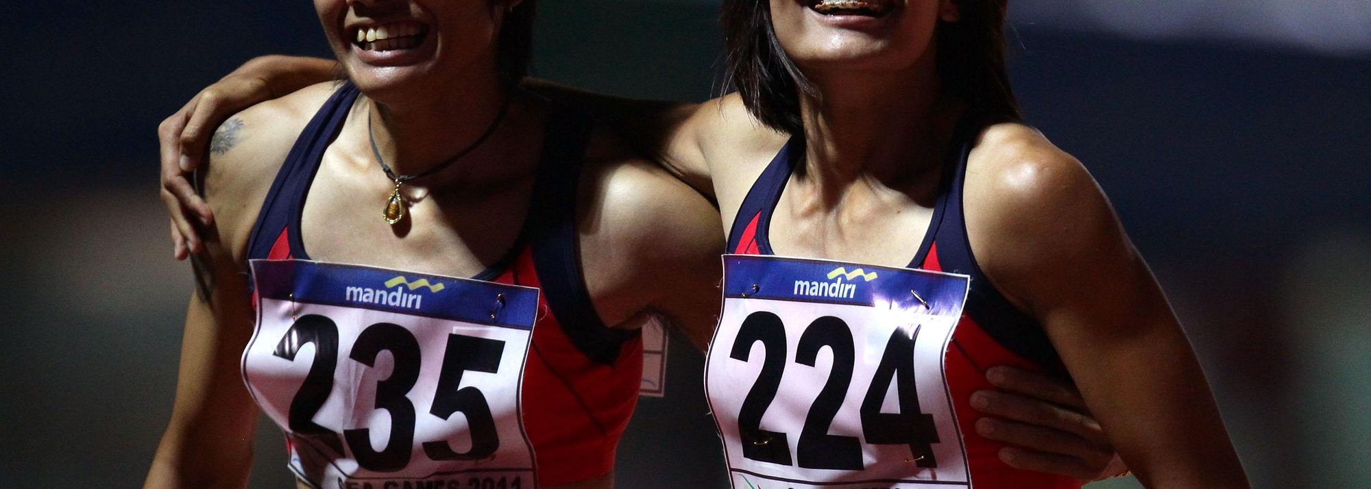 Wal Punsoongneun (R) and Wassana Wunatho (L) of Thailand celebrate their Gold and Bronze medal places respectively in the Womens 100m Hurdles Final on day three of the 2011 Southeast Asian Games at Jakabaring Sports Complex on 13 November 2011 in Palembang, Sumatra, Indonesia (© Getty Images)
