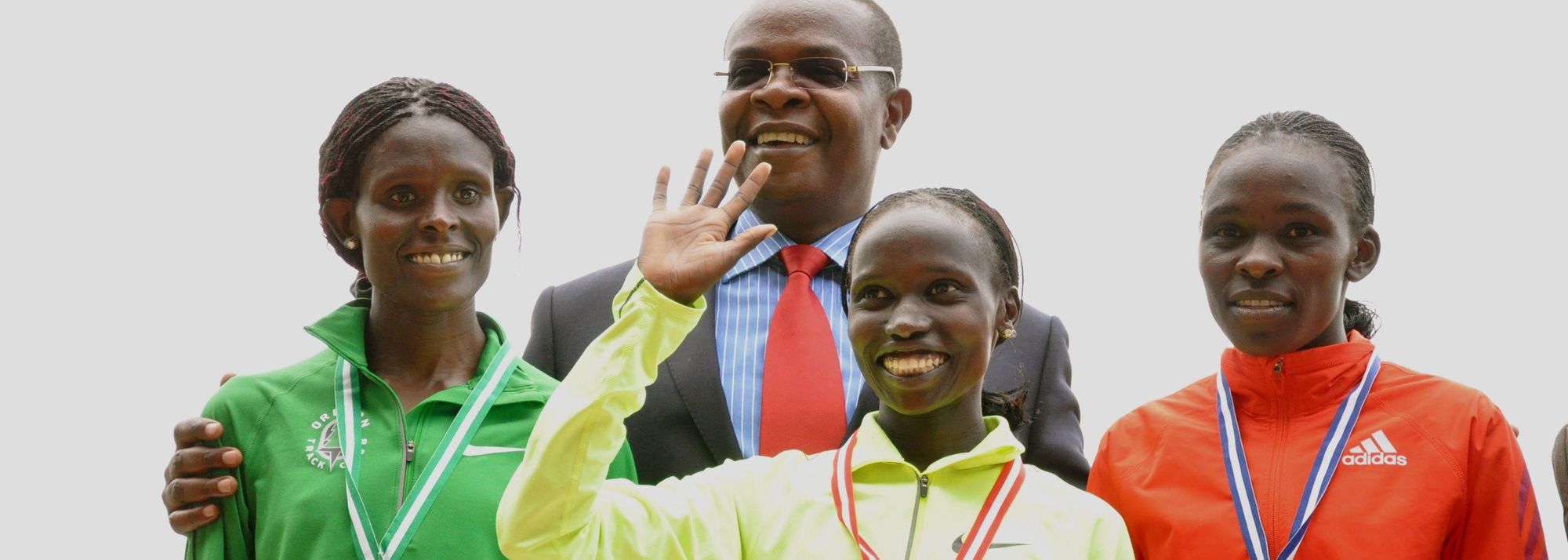 Sally Kipyego, Vivian Cheruiyot and Joyce Chepkirui in Nairobi with Kenyan Sports Minister Dr. Paul Otuoma (© Muthoni Njuki, Capital FM)