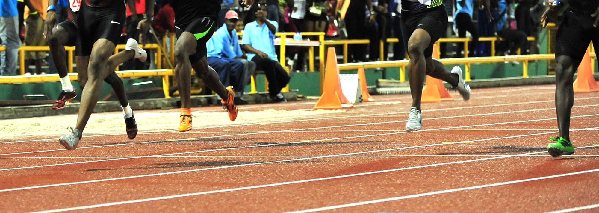 Richard Thompson (l) bolts to victory in the National Championship men's 100m, in Port of Spain. Thompson clocked a 9.85 national record. (© Stephen Doobay / Trinidad Express)
