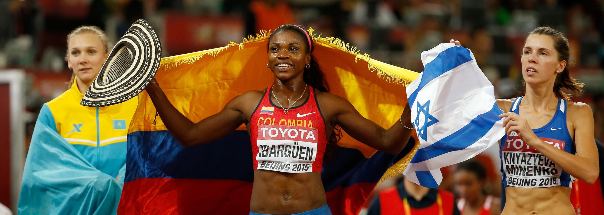 (L-R) Bronze medallist Olga Rypakova of Kazakhstan, gold medallist Caterine Ibarguen of Colombia, and silver medallist Hanna Minenko of Israel celebrate after the women's triple jump at the IAAF World Championships, Beijing 2015 (© Getty Images)