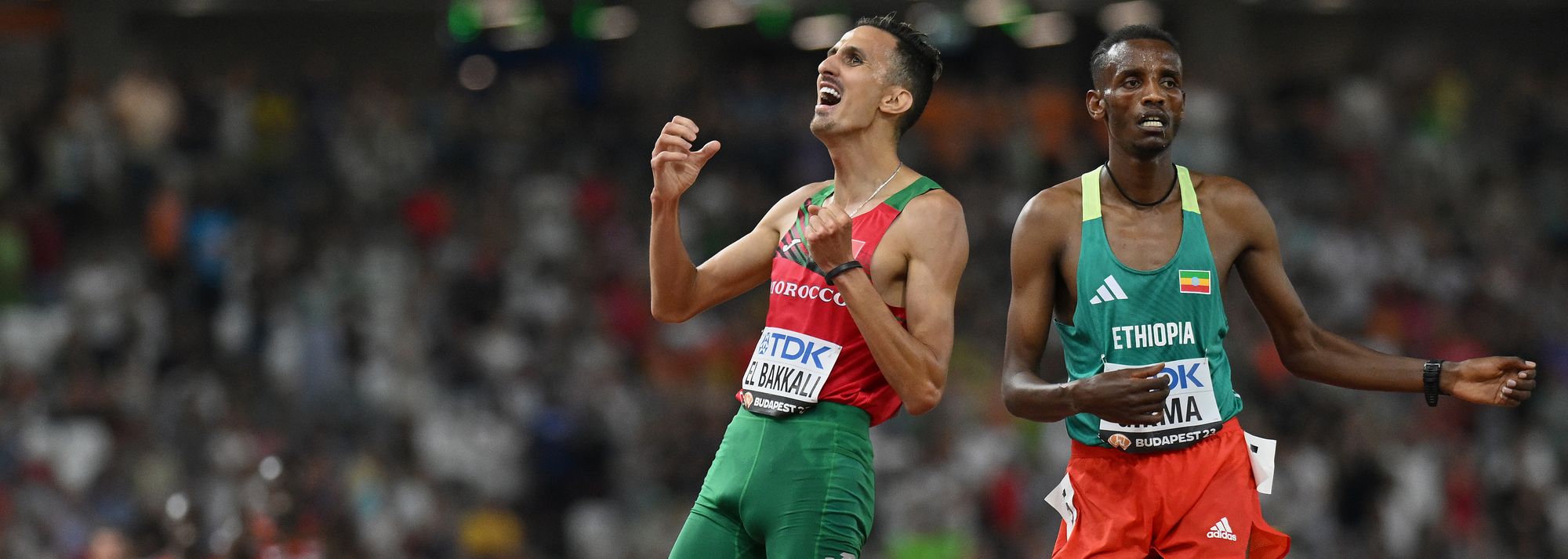 Soufiane El Bakkali beats Lamecha Girma in the 3000m steeplechase at the World Athletics Championships Budapest 23 (© Getty Images)
