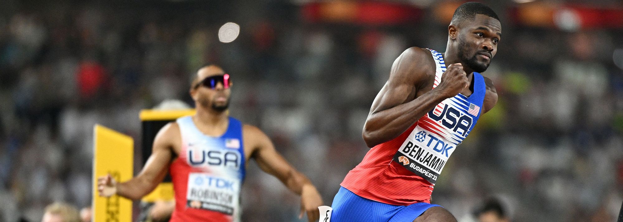 Rai Benjamin in relay action in Budapest (© AFP / Getty Images)
