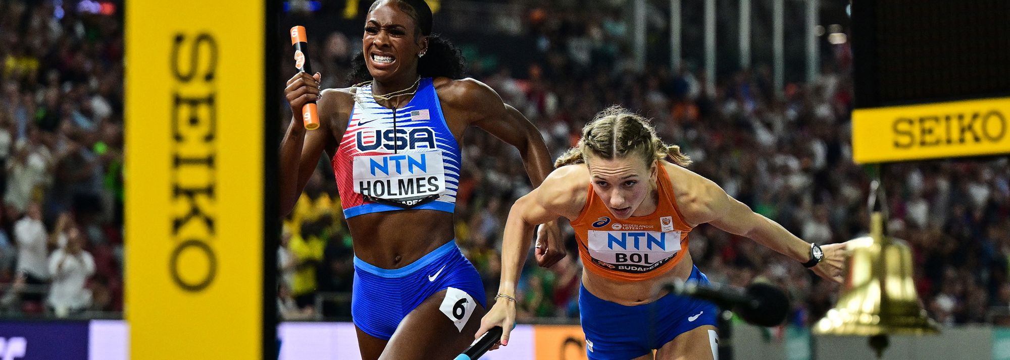 Alexis Holmes and Femke Bol battle in the mixed 4x400m in Budapest (© AFP / Getty Images)