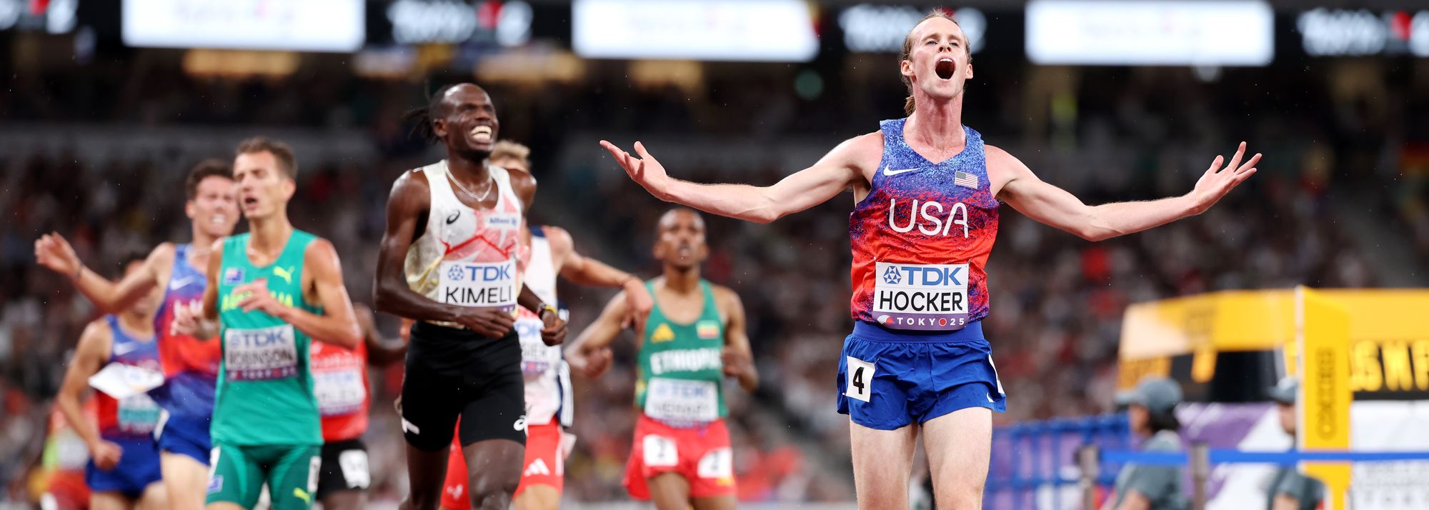 Cole Hocker celebrates his 5000m win at the World Athletics Championships Tokyo 25 (© Getty Images)