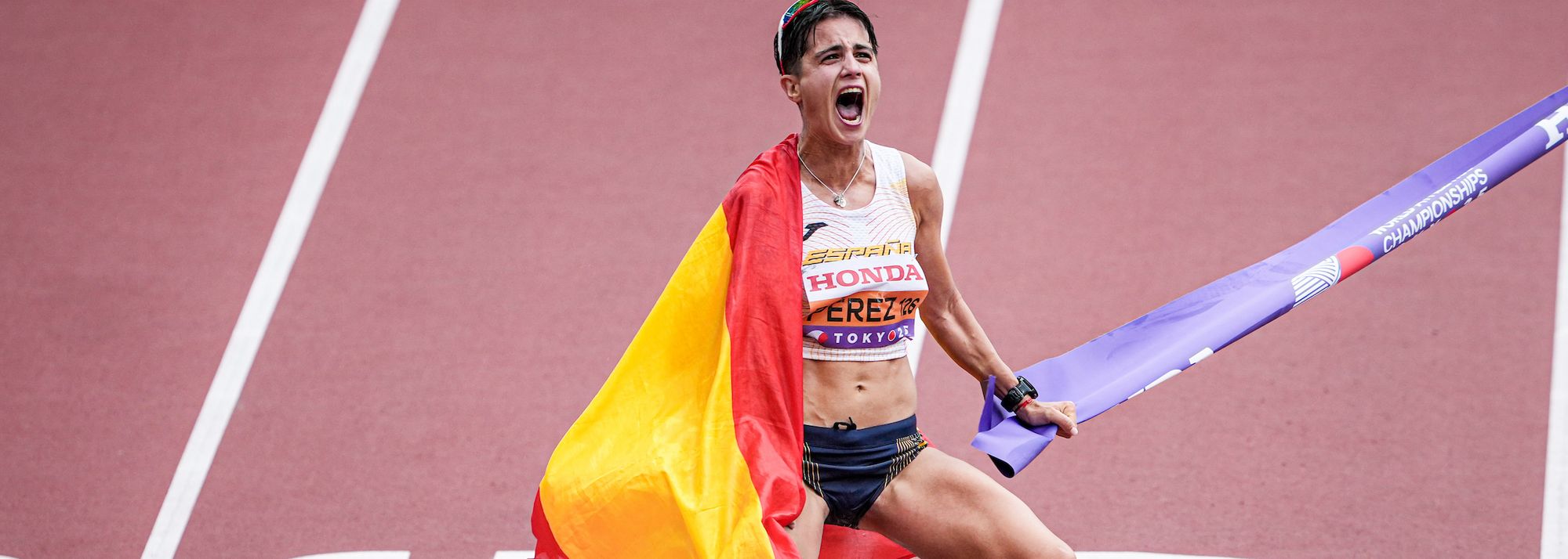 Maria Perez celebrates her 35km race walk win in Tokyo (© World Athletics CameraPamela Smith)