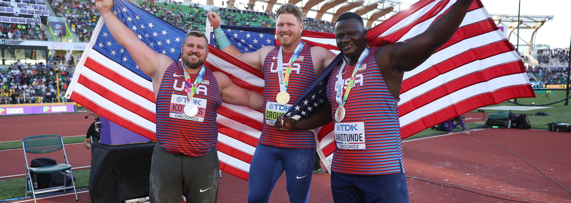 Men's shot put medallists Joe Kovacs, Ryan Crouser and Josh Awotunde at the World Athletics Championships (© Getty Images)