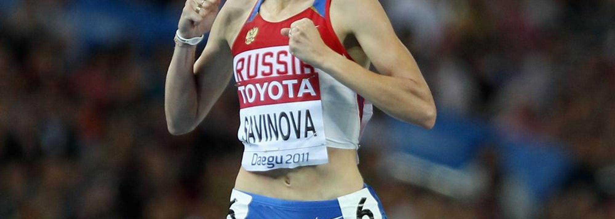 Mariya Savinova of Russia crosses the finish line to claim victory in the women's 800 metres final (© Getty Images)