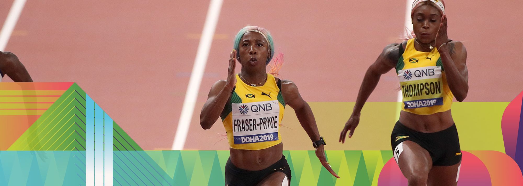 Shelly-Ann Fraser-Pryce and Elaine Thompson-Herah race at the World Championships in Doha (© Getty Images)