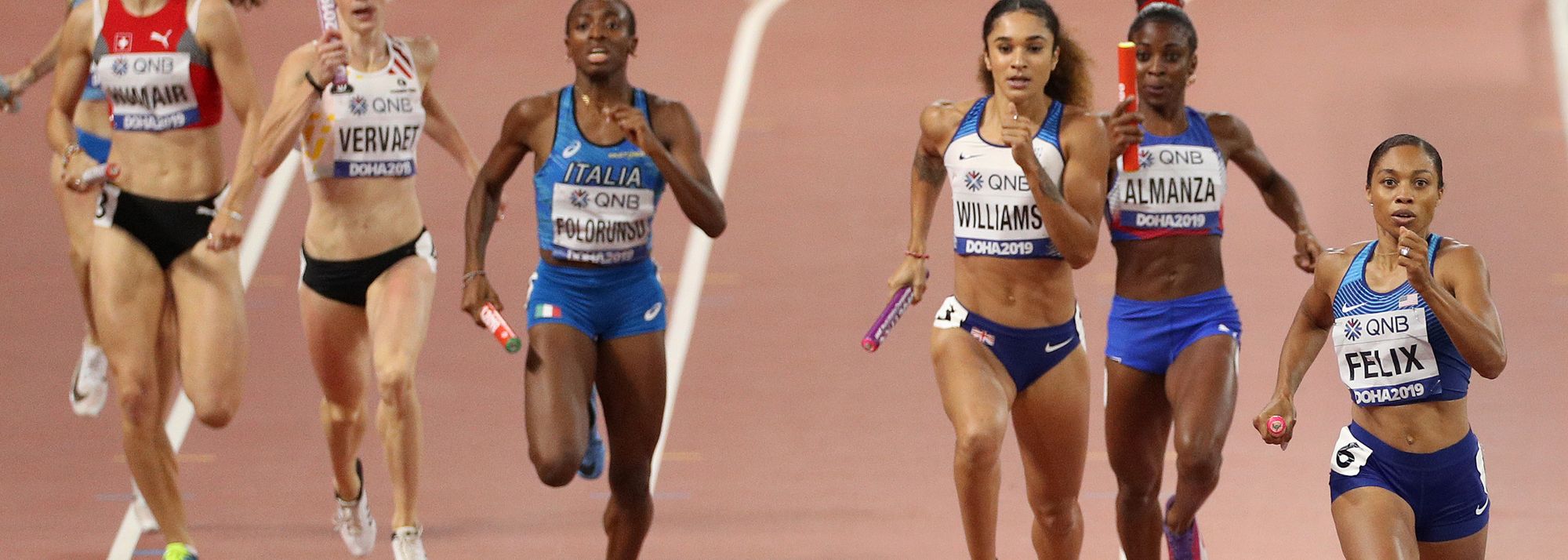 Athletes in action in the 4x400m at the World Athletics Championships (© Getty Images)