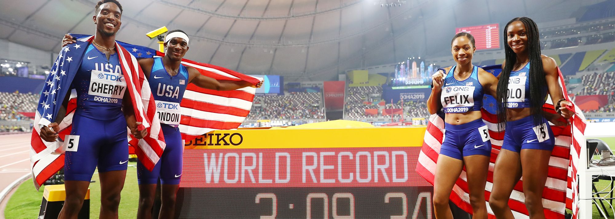 USA quartet wins the mixed 4x400m relay in a world record time at the World Athletics Championships Doha 2019 (© Getty Images)