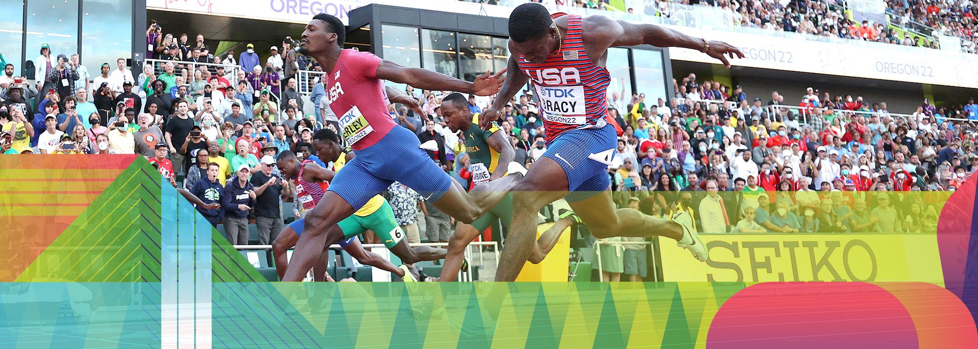 “I lost the Olympics by 0.04,” Kerley said of placing behind Italy’s Marcell Jacobs, who withdrew from the Oregon semifinals so as not to risk further injury. “I saw Bracy in front of me — he dipped early and I dipped at the right time and got the job done.”