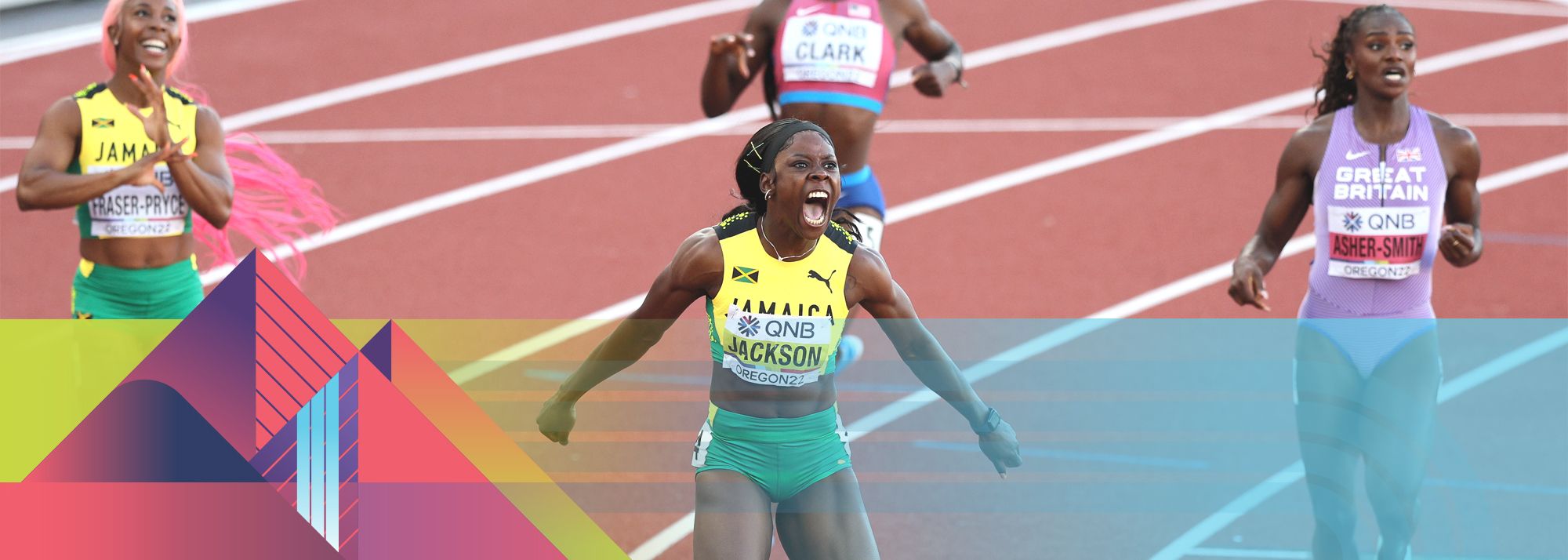Shericka Jackson wins the 200m in a championship record at the World Athletics Championships Oregon22 (© Getty Images)