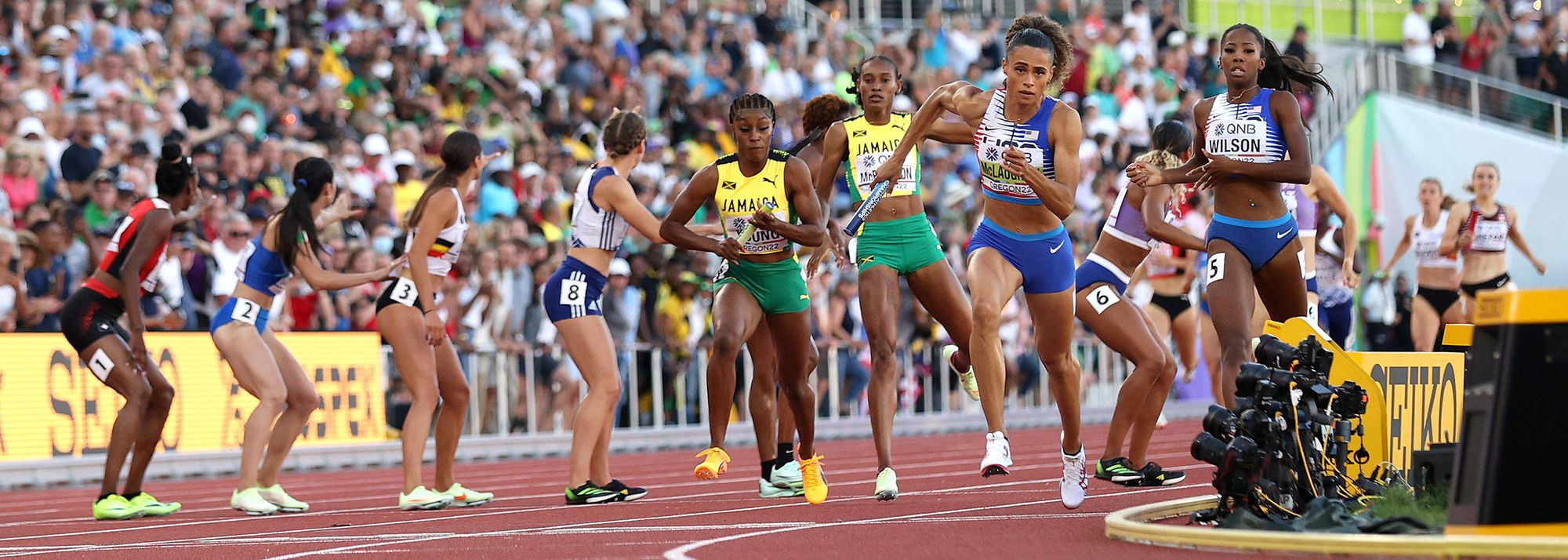 Sydney McLaughlin heads off on her anchor leg, to take the US team to 4x400m victory in Oregon (Β© Getty Images)