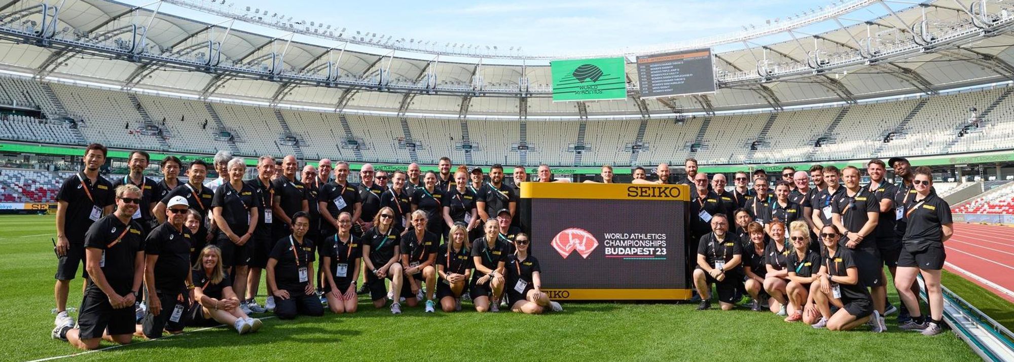 The Seiko Timing Team gathers at the 2023 World Athletics Championships in Budapest, Hungary. (© Seiko Time Creation Inc.)