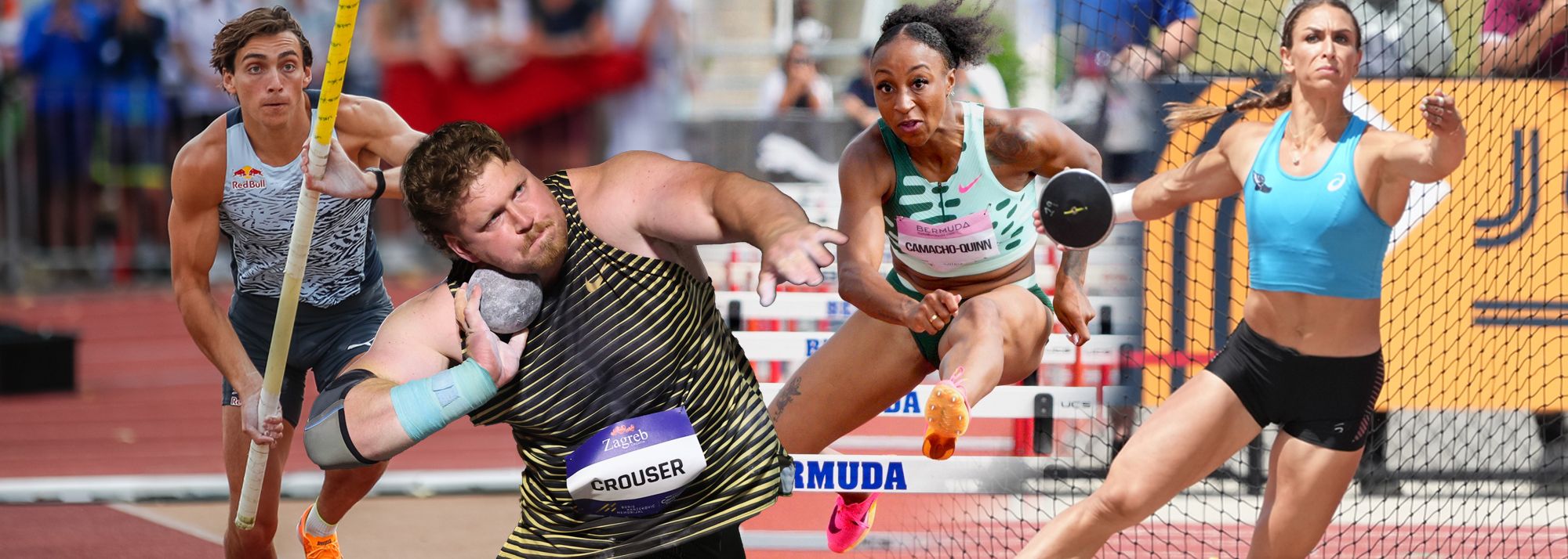 Mondo Duplantis, Ryan Crouser, Jasmine Camacho-Quinn and Valarie Allman in the Continental Tour Gold (© David Balogh, Zagreb Meeting, Bermuda Grand Prix, Errol Anderson)