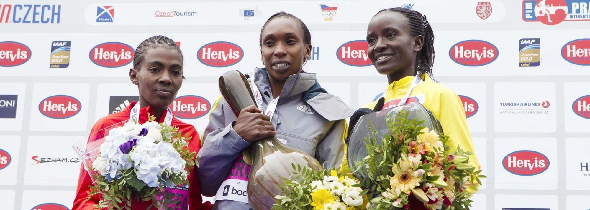 Worknesh Degefa, Gladys Cherono and Isabella Ochichi on the podium at the 2013 Hervis Prague Half Marathon (© Hervis Prague Half Marathon )