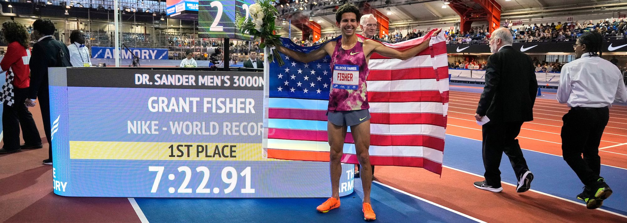 Double Olympic bronze medallist Grant Fisher runs 7:22.91 at the Millrose Games, a World Athletics Indoor Tour Gold meeting, in New York to break the world indoor 3000m record of 7:23.81 that had been set by Lamecha Girma in Lievin in 2023. Cole Hocker finishes second in 7:23.14, also inside Girma’s record.