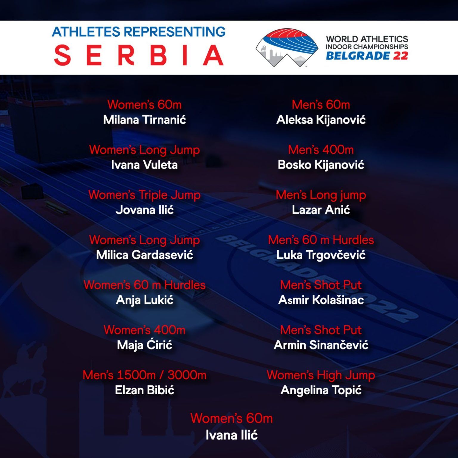 The list of the Serbian record number national team members who will under the arches of the Arena defend colours of Serbia at the World Championships is, until now, made of: Ivana Vuleta (long jump), Asmir Kolasinac (shot put), Armin Sinancevic (shot put), Maja Ciric (400m), Elzan Bibic (1500m/3000m), Bosko Kijanovic (400m), and Anja Lukic (60m hurdles) who will compete at the WC Belgrade 2022 because they met qualification norms while other eight athletes of Serbia received “special invitations” from the World Athletics based on good results achieved during the season (Luka Trgovcevic (60m hurdles), Milana Tirnanic (60m), Jovana Ilic (triple jump), Aleksa Kijanovic (60m), Angelina Topic (high jump), Lazar Anic (long jump), Ivana Ilic (60m), and Milica Gardasevic (long jump).
