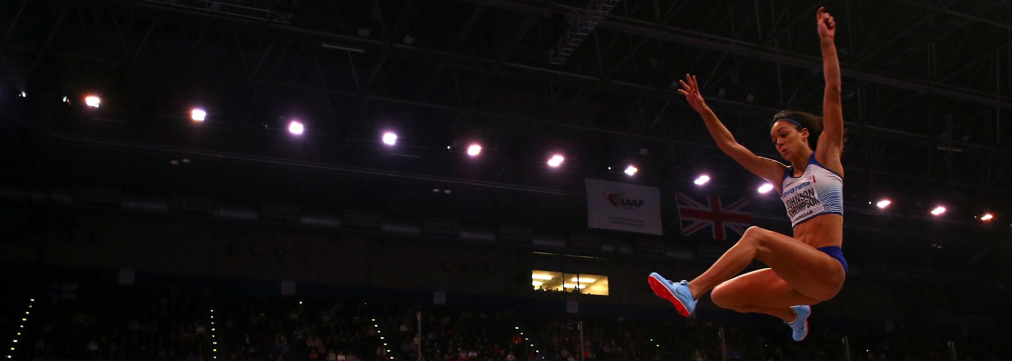 Katarina Johnson-Thompson in the pentathlon long jump at the IAAF World Indoor Championships Birmingham 2018 (© Getty Images)