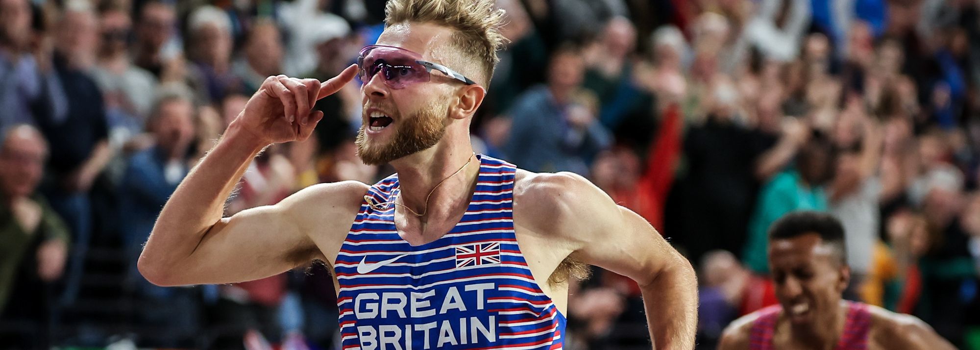 Josh Kerr celebrates his world indoor 3000m win in Glasgow (© Dan Vernon)