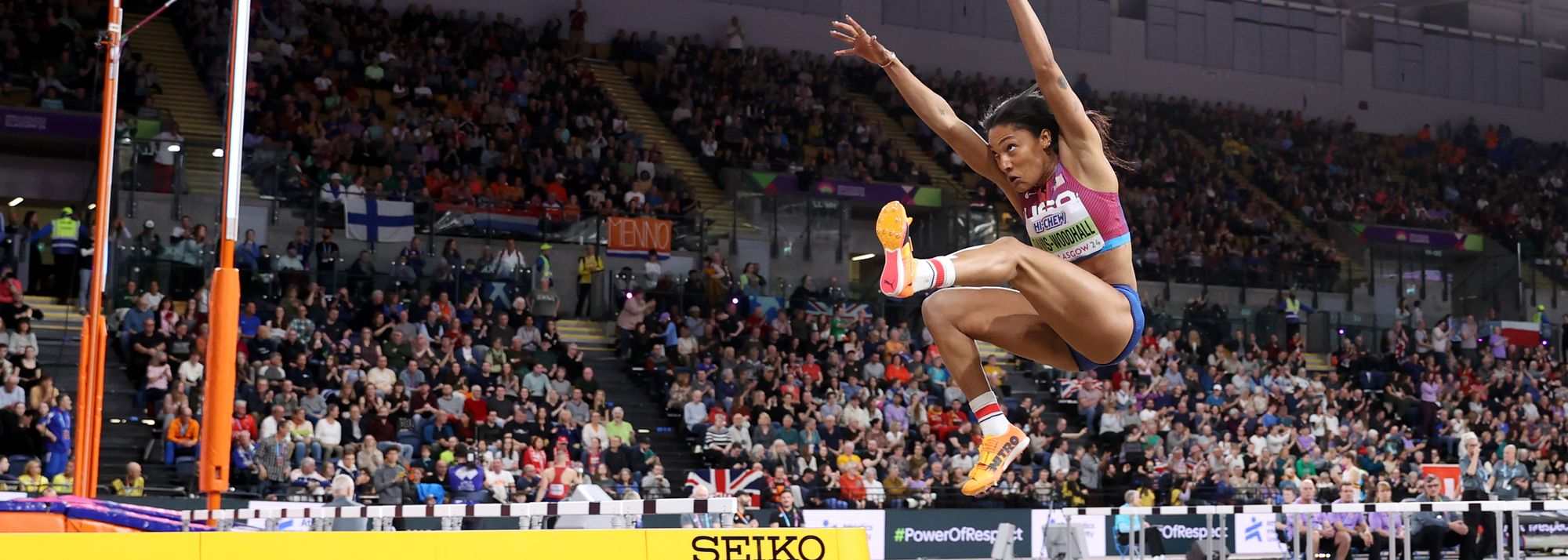 Tara Davis-Woodhall soars to the world indoor long jump title in Glasgow (© Getty Images)