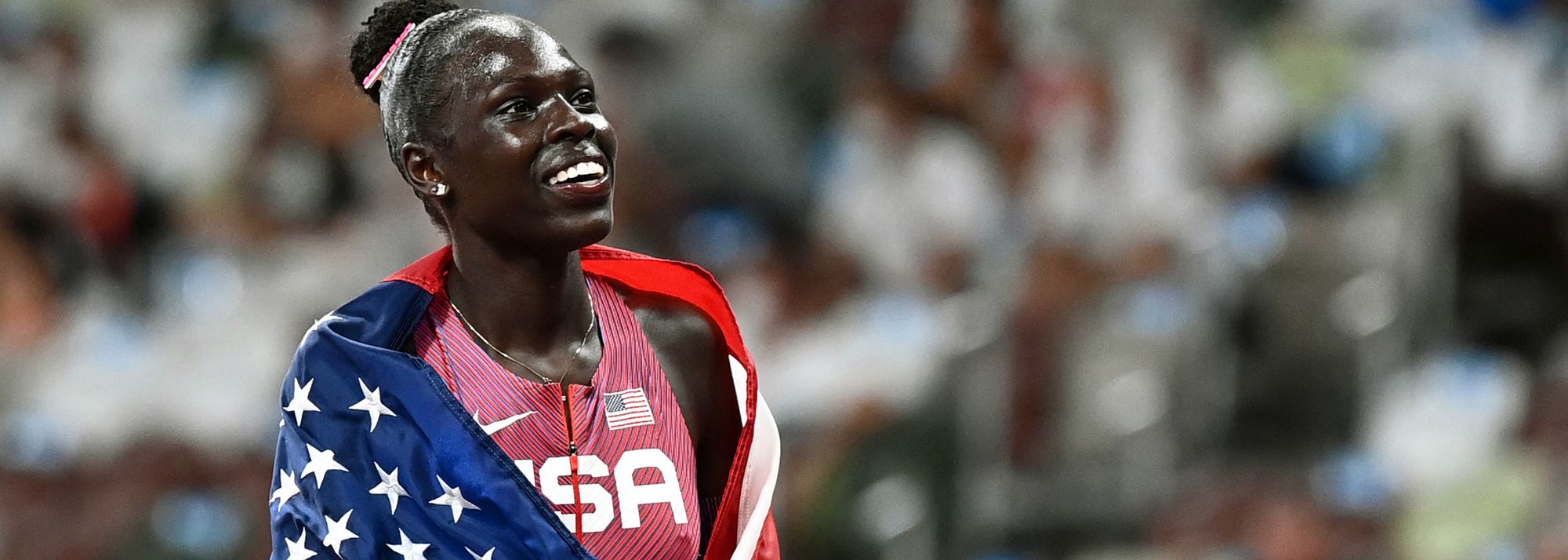 Athing Mu after winning the 800m at the Tokyo Olympic Games (© AFP / Getty Images)