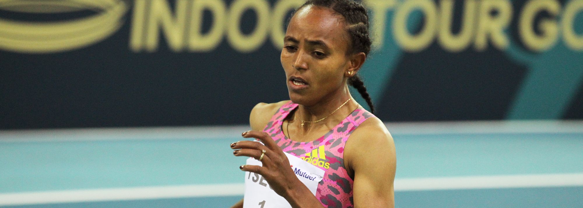 Gudaf Tsegay on her way to setting a world indoor 1500m record in Lievin (© Jean-Pierre Durand)