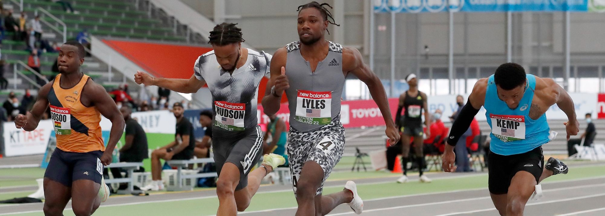 Noah Lyles in 60m action at the New Balance Indoor Grand Prix (© Getty Images)