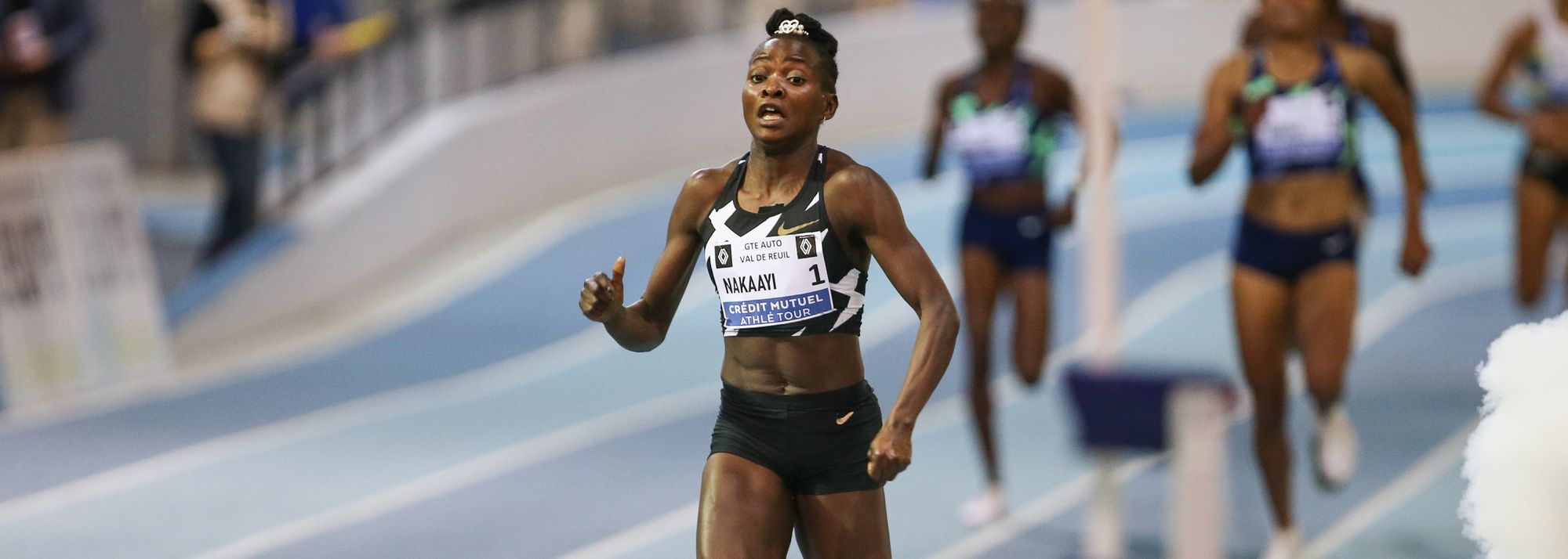 After improving the Ugandan indoor record to 2:01.42 when winning in Lievin a week ago, Nakaayi dipped under two minutes for the first time, running 1:59.55 for a dominant victory in what was the sixth indoor race of her career.