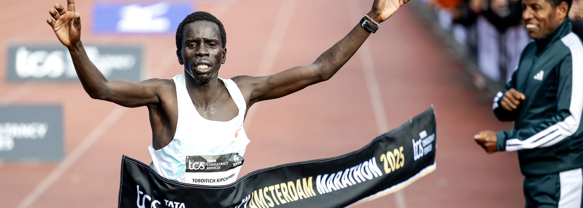 In just his second race over the distance, Kenya’s Geoffrey Toroitich Kipchumba broke the course record at the TCS Amsterdam Marathon, winning the World Athletics Platinum Label road race on Sunday (19) in 2:03:30.