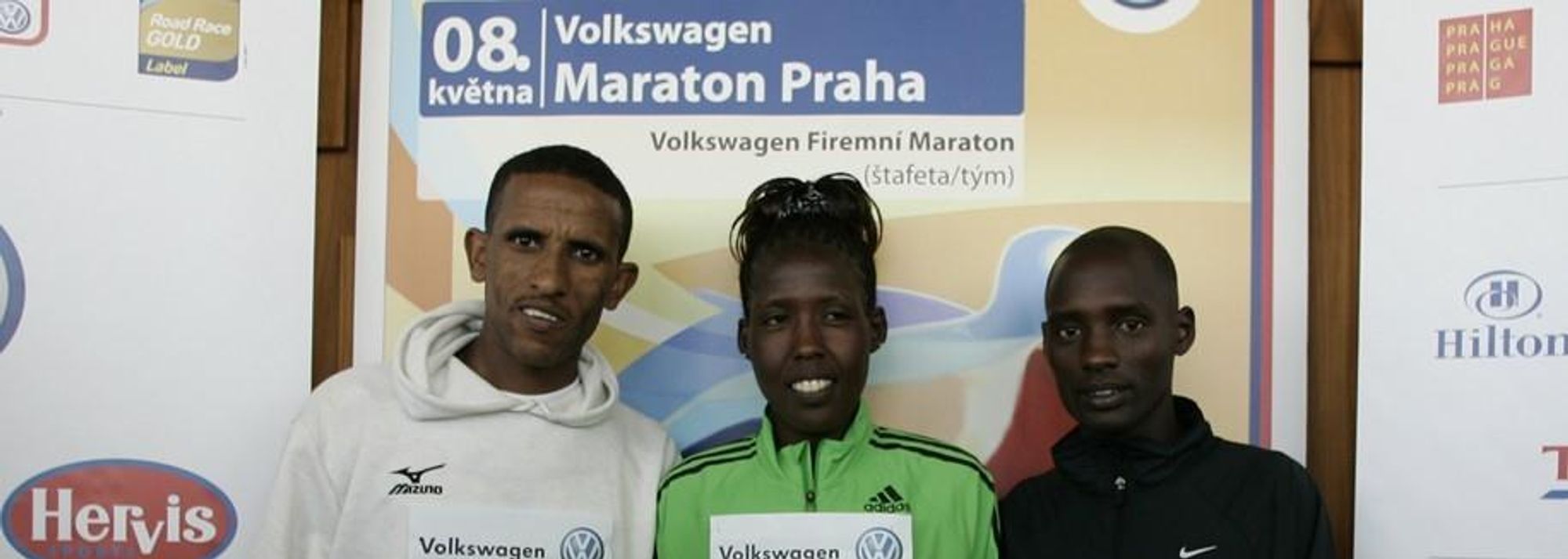 Yemane Tsegay of Ethiopia and Kenyans Sammy Kosgei and Lydia Cheromei at the pre-race press conference in Prague (© Jean-Pierre Durand)