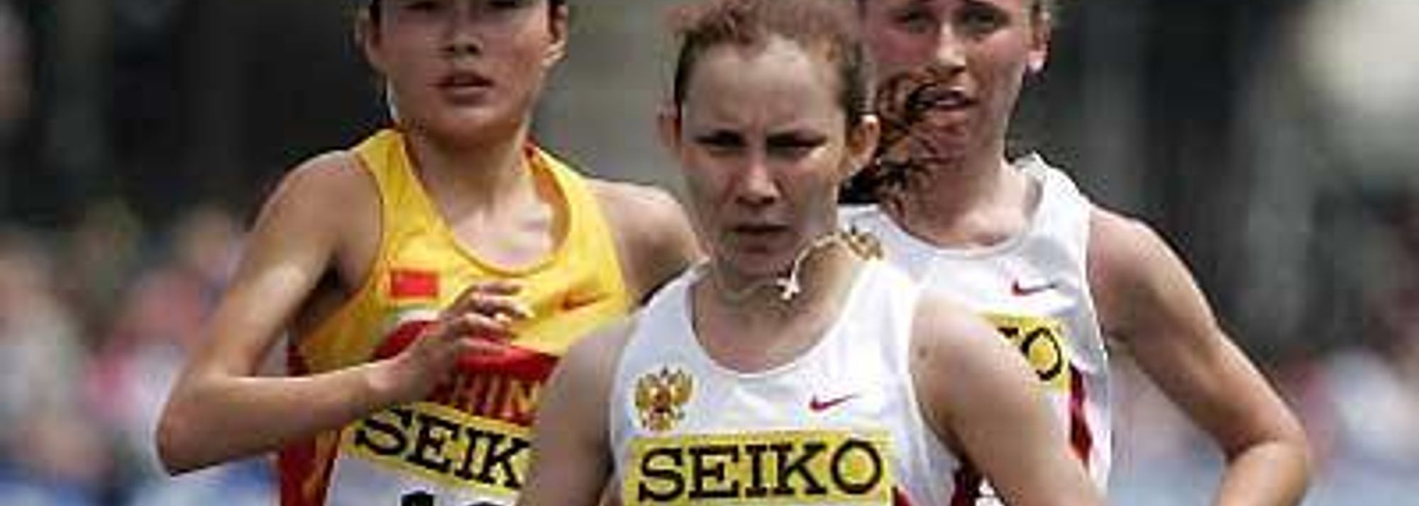 By 6km the pace for Sokolova slowed again to 4:35 for the kilometre and Ladanova, who had lunged to the side to grab a sponge to cool her brow, closed again. Then as the leaders reached the full lap marker together at 26:48, Sokolova reasserted her leadership. However, as the Russians watched each other Chai was also closing rapidly - at 4:23 to their 4:37.