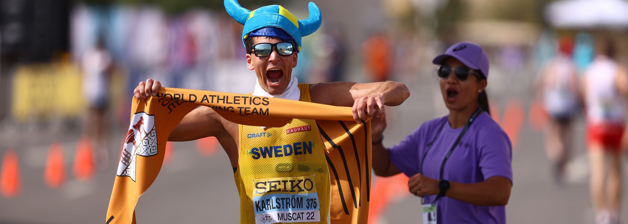 Perseus Karlstrom took the liberty of donning his trademark mock Viking helmet a kilometre before the finish of the 35km at the World Athletics Race Walking Team Championships Muscat 22.