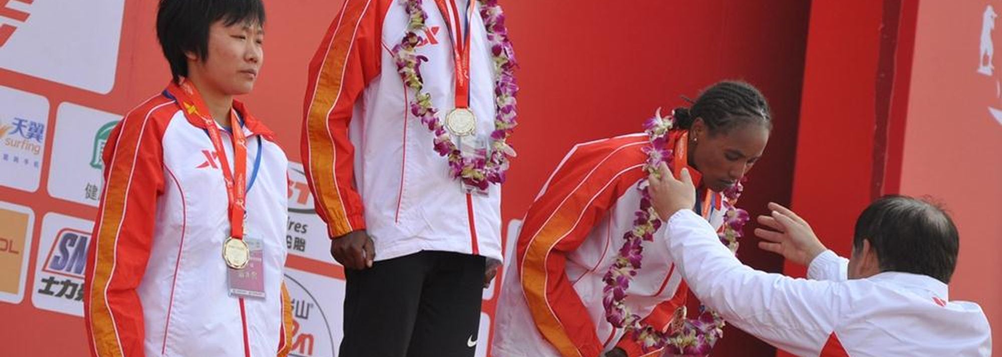 Women’s podium in Xiamen – winner Amane Gobena (c), runner-up Alemitu Abera (r) and China's Wang Jiali (l) (© Organisers)