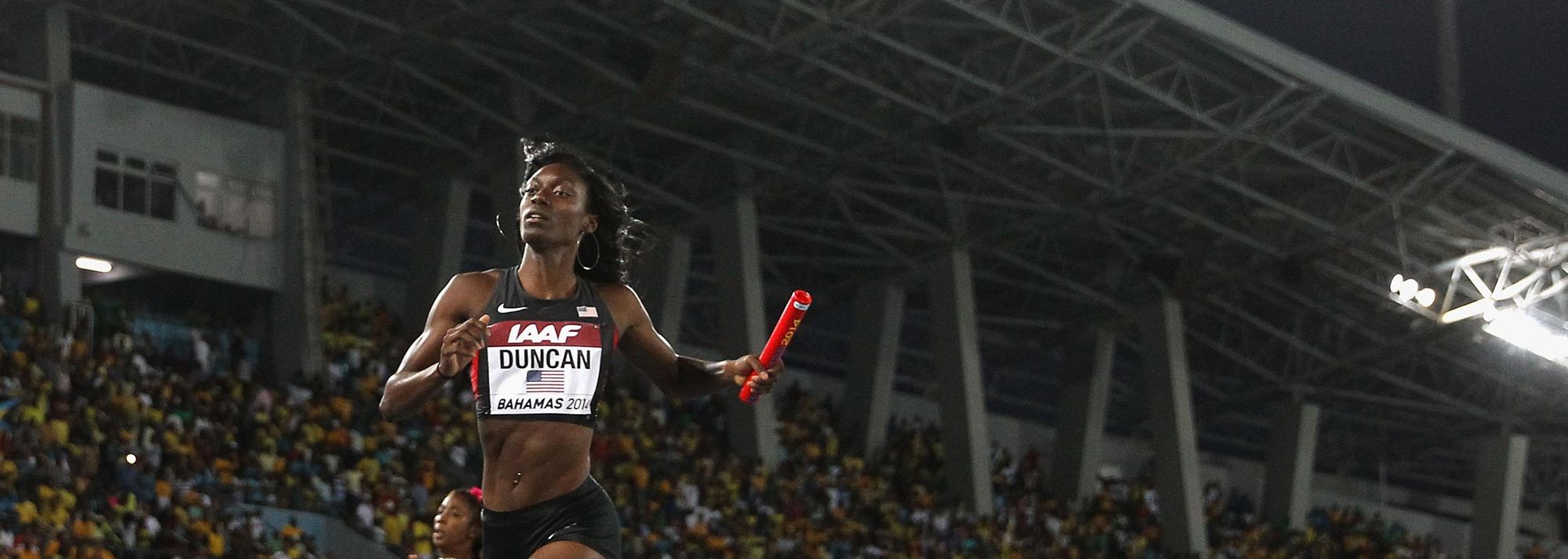 Kimberlyn Duncan of the United States crosses the finish line to win the women's 4x200m at the IAAF World Relays (© Getty Images)