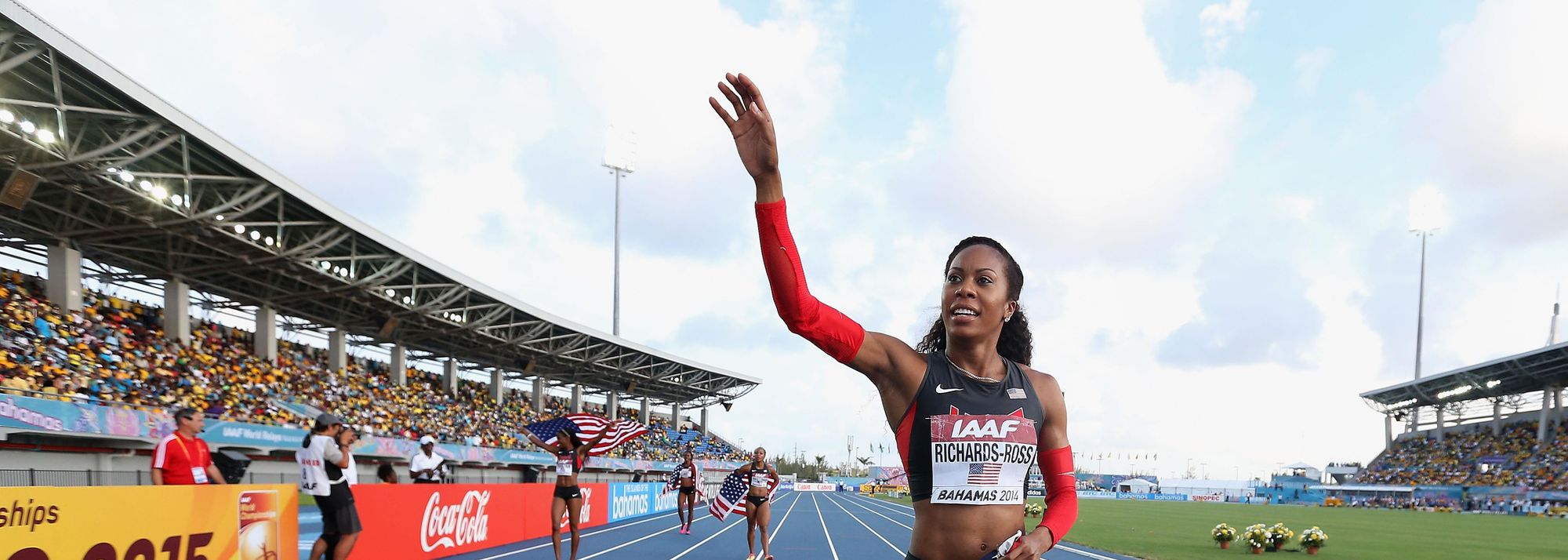 Sanya Richards-Ross of the United States waves to fans after winning the women's 4x400m at the IAAF World Relays (© Getty Images)