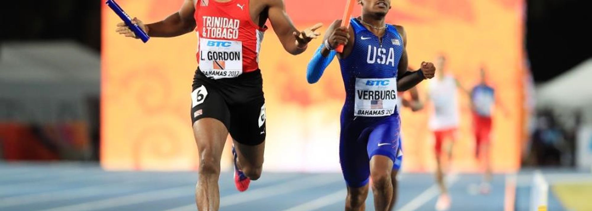 In the second heat, Trinidad and Tobago caused an upset, their anchor man Lalonde Gordon coming from several metres back to pass David Verburg of the US with just metres to run.