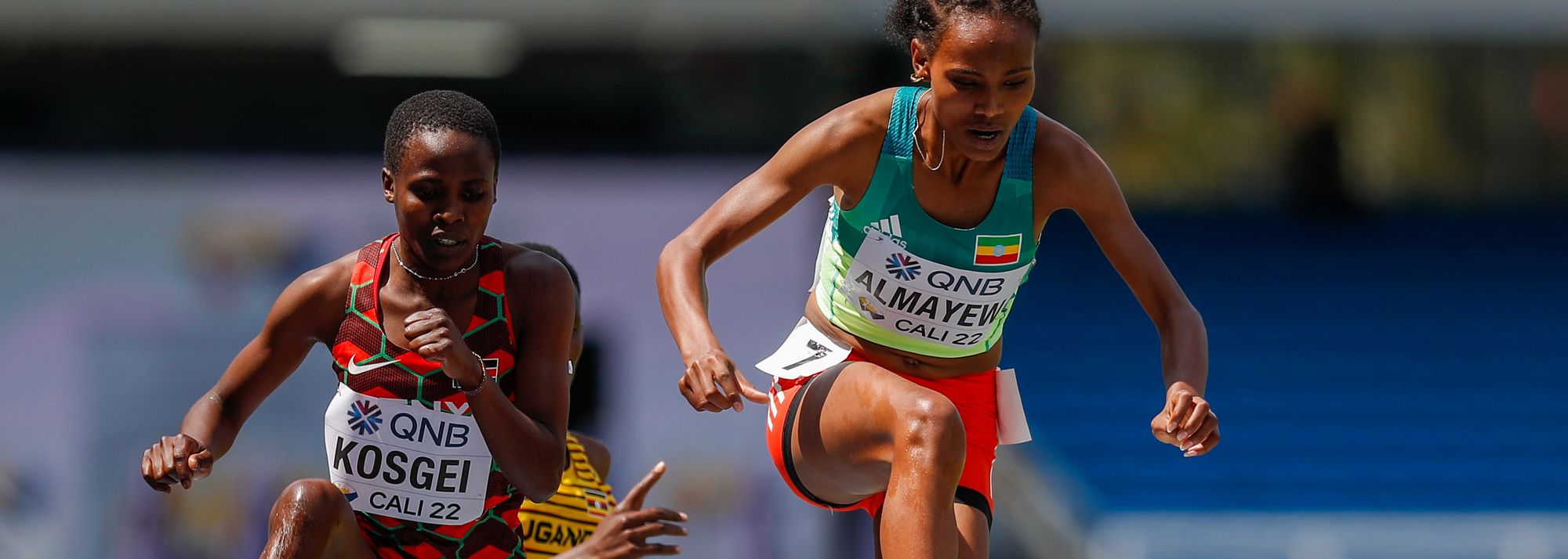 Sembo Almayew in the 3000m steeplechase heats at the World Athletics U20 Championships Cali 22 (© Oscar Munoz Badilla)
